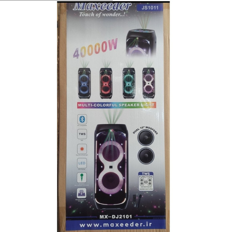 اقلام همراه بلندگو: میکروفون بی سیم، ریموت کنترل، کابل AUX جک 3.5 یک به یک، کابل اتصال به برق شهر ، دفترچه راهنما، کارت گارانتی